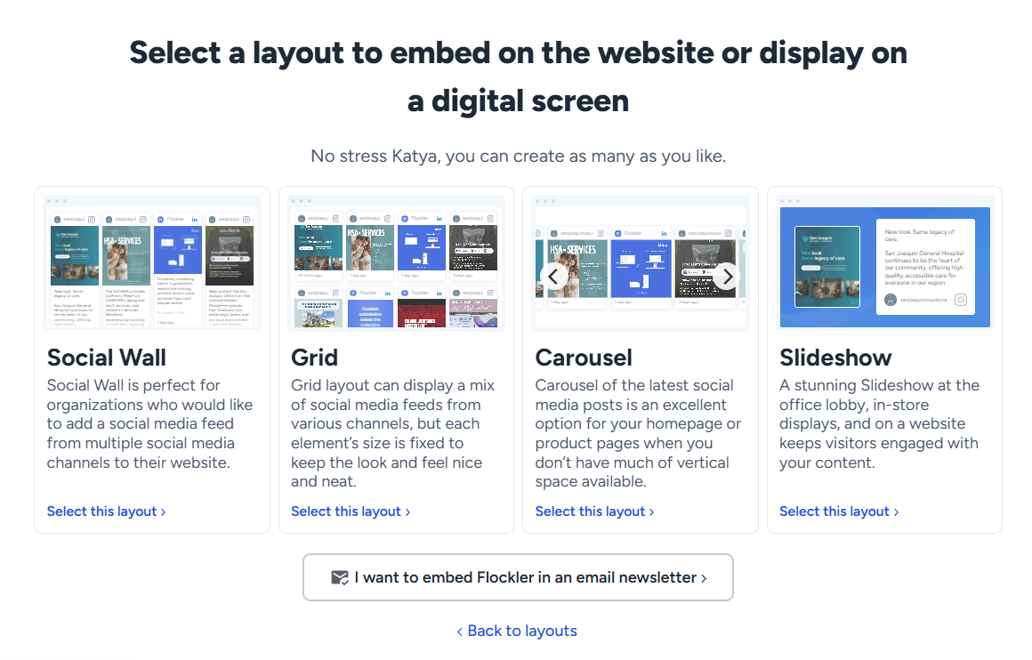 Once you’ve got some content stored with Flockler, click 'Display' in Flockler’s navigation, and select a layout for your feed.
