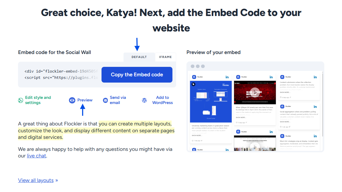 After selecting your layout, you’ll receive a preview URL and an embed code to add to the Wix editor.