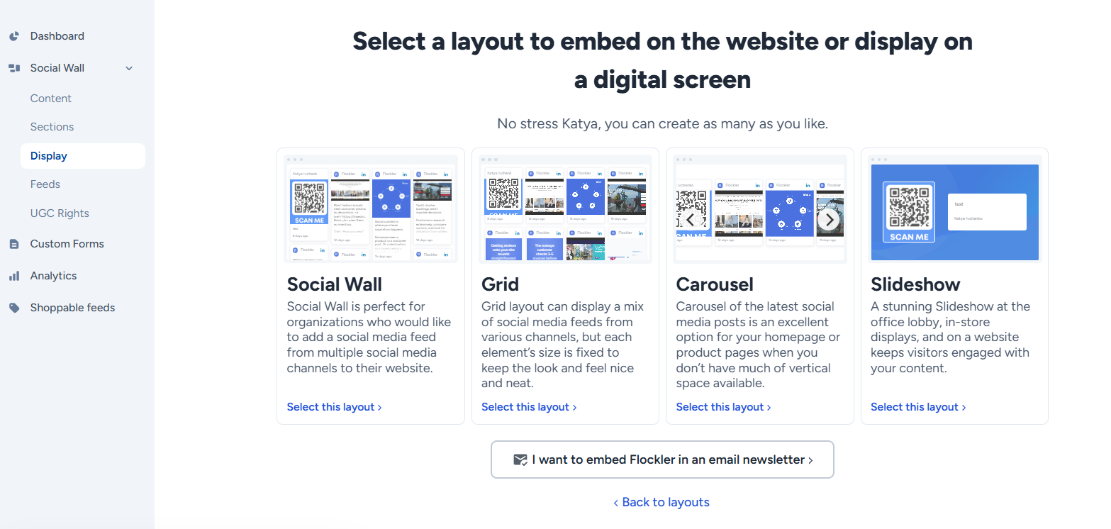 After adding content to your Flockler, the next step is to click ‘Display’ in Flockler’s navigation. Flockler has 4 different layout options (Wall, Grid, Carousel, and Slideshow) to embed on any Webflow page. Select one of the layouts, and you’ll get an embed code.
