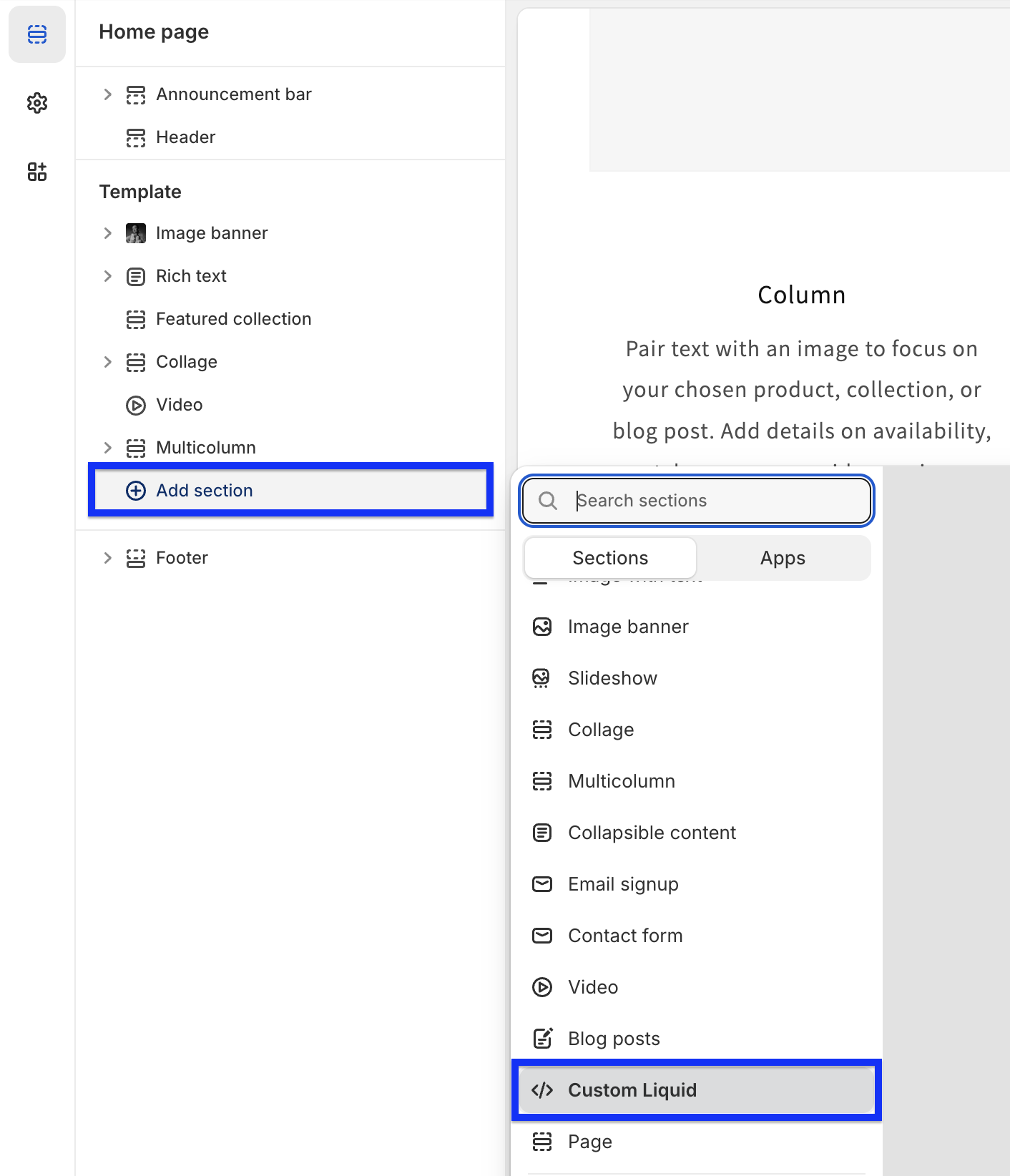 Go to the page where you want to add your Flockler layout within your Theme editor (Home page in the example). Under the "Template" drop down click on the "Add section" option and search for the "Custom liquid" template: