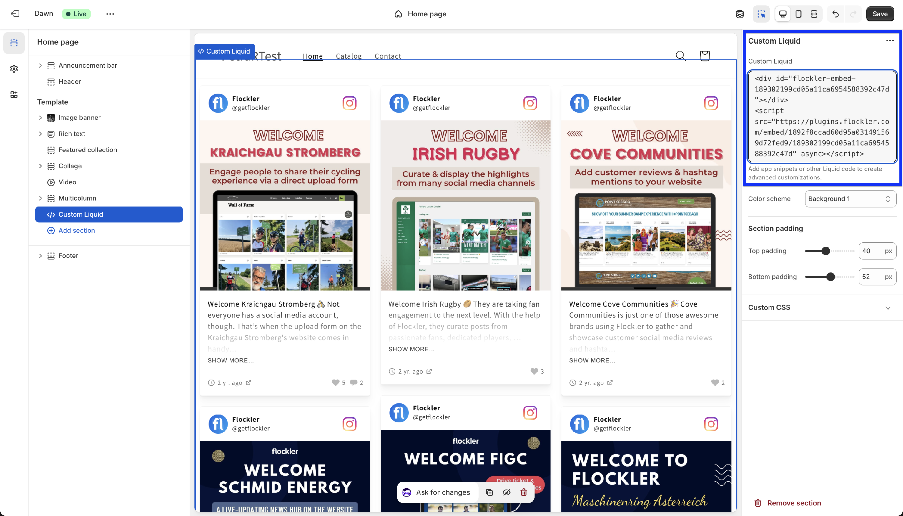 You will see the Custom Liquid box on your right where you will be able to paste your Flockler embed code and your Flockler layout will appear right on your Theme page: