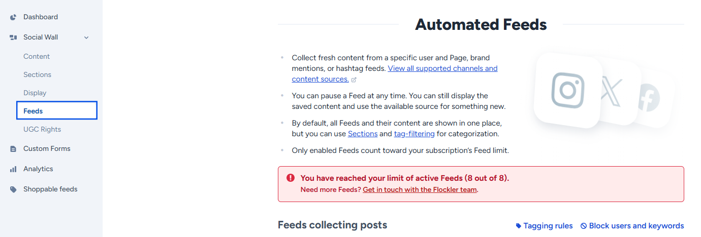 Your Flockler plan includes a fixed number of feeds, and a feed means one configuration you create. It’s not tied to the platform itself but to the setup. For example, if you need to pull 10 different hashtags on X, that counts as 10 separate feeds.