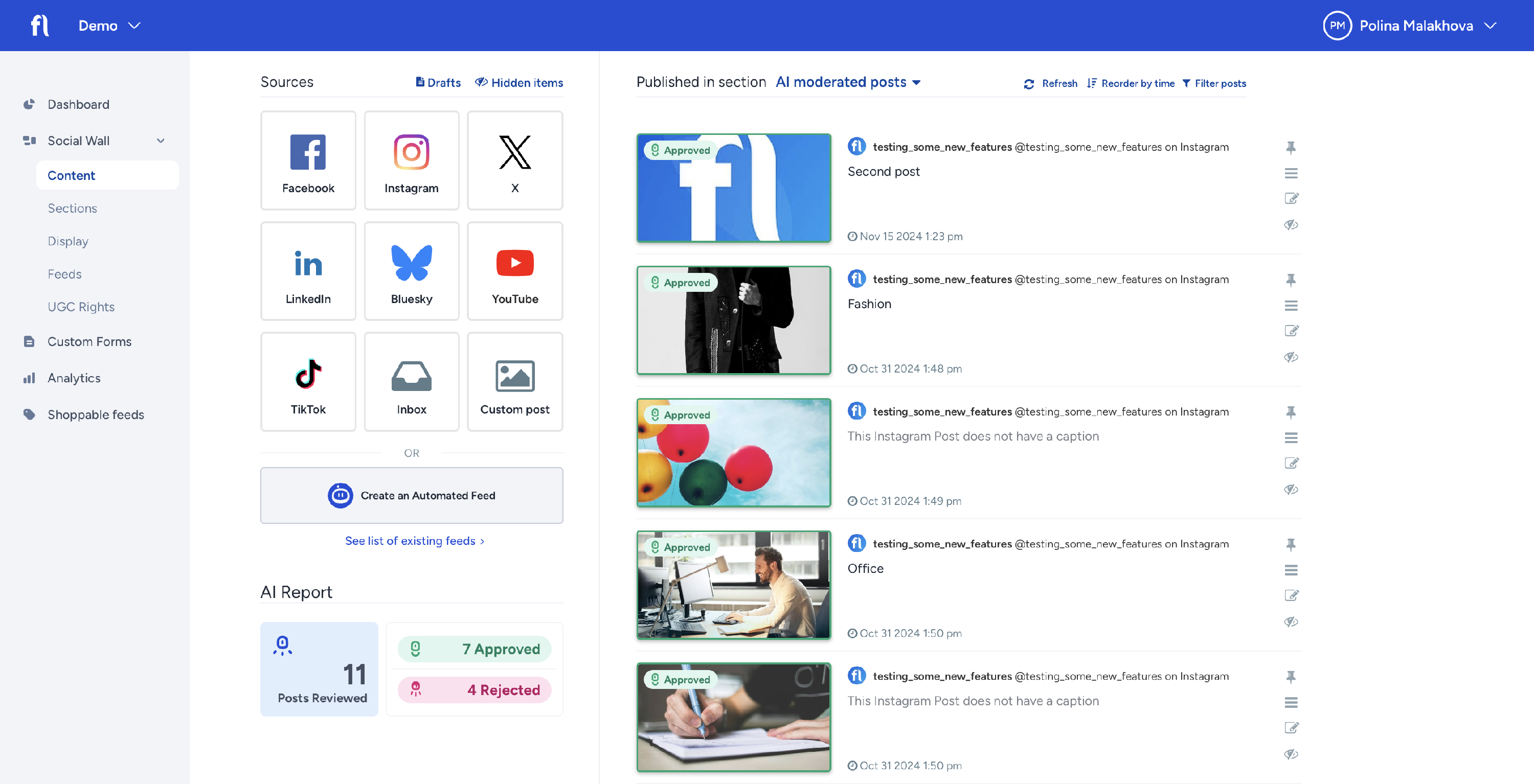 AI moderation currently supports only images and text. If your feed includes videos, they will not be reviewed by AI moderation, only the text will be.