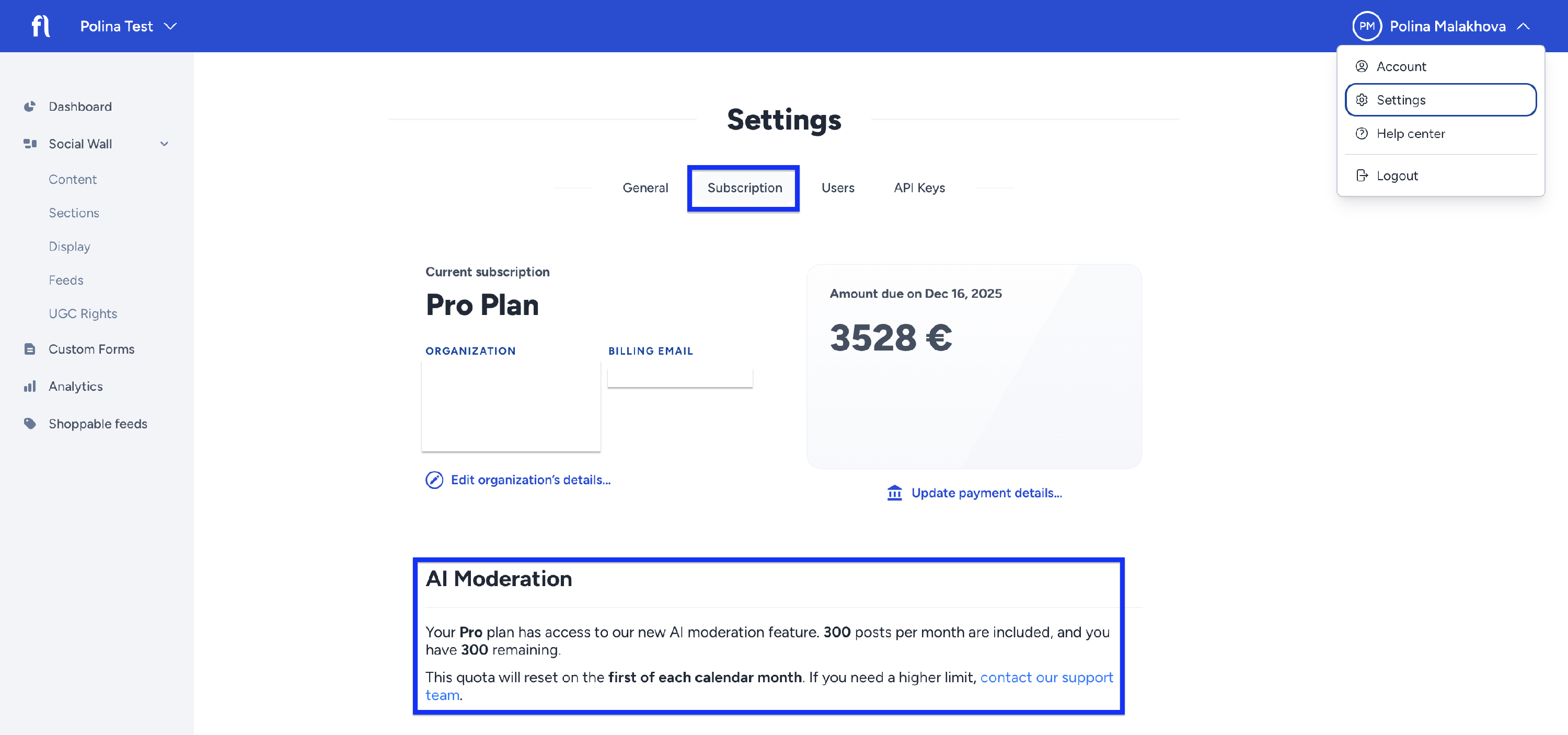 Each Business, Pro, and Premium plan includes a default limit of 300 moderated posts per calendar month, which resets on the first of each month. Track your moderation count on the Subscription tab anytime, and if you need a higher limit, our support team at team@flockler.com is here to help