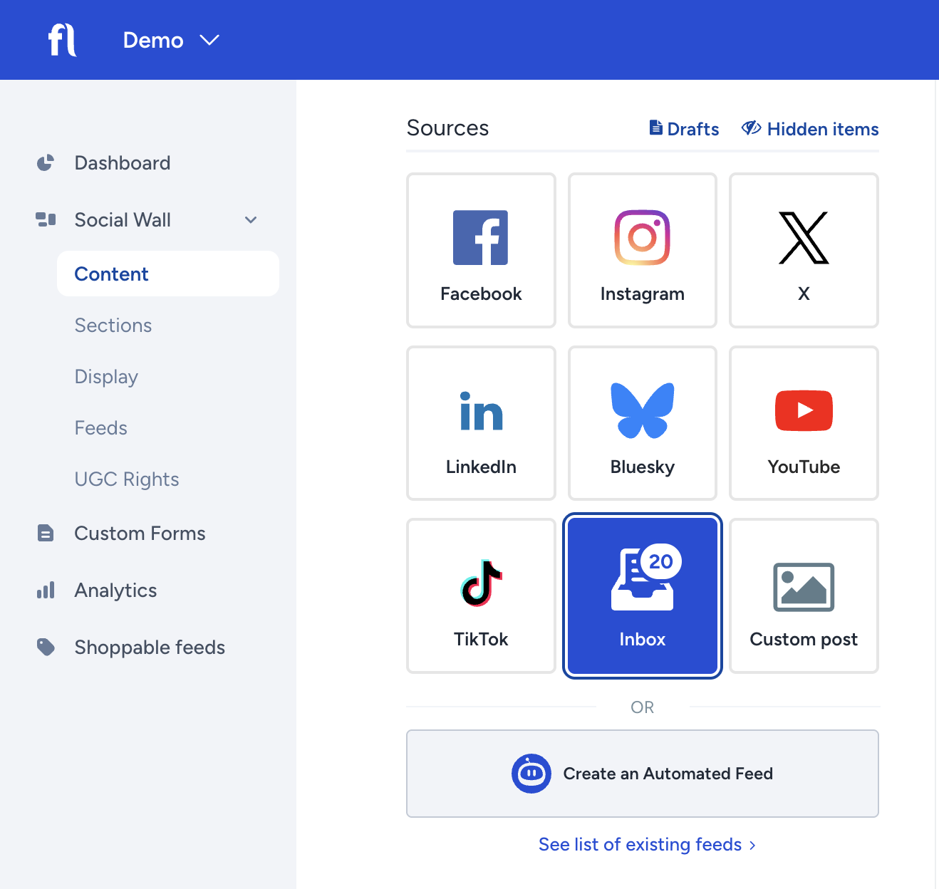Prefer to review posts before they go live? With this option, new posts from your automated feeds will be sent to the Inbox in your Content tab. From there, you can manually approve each post to ensure it aligns with your brand's values.