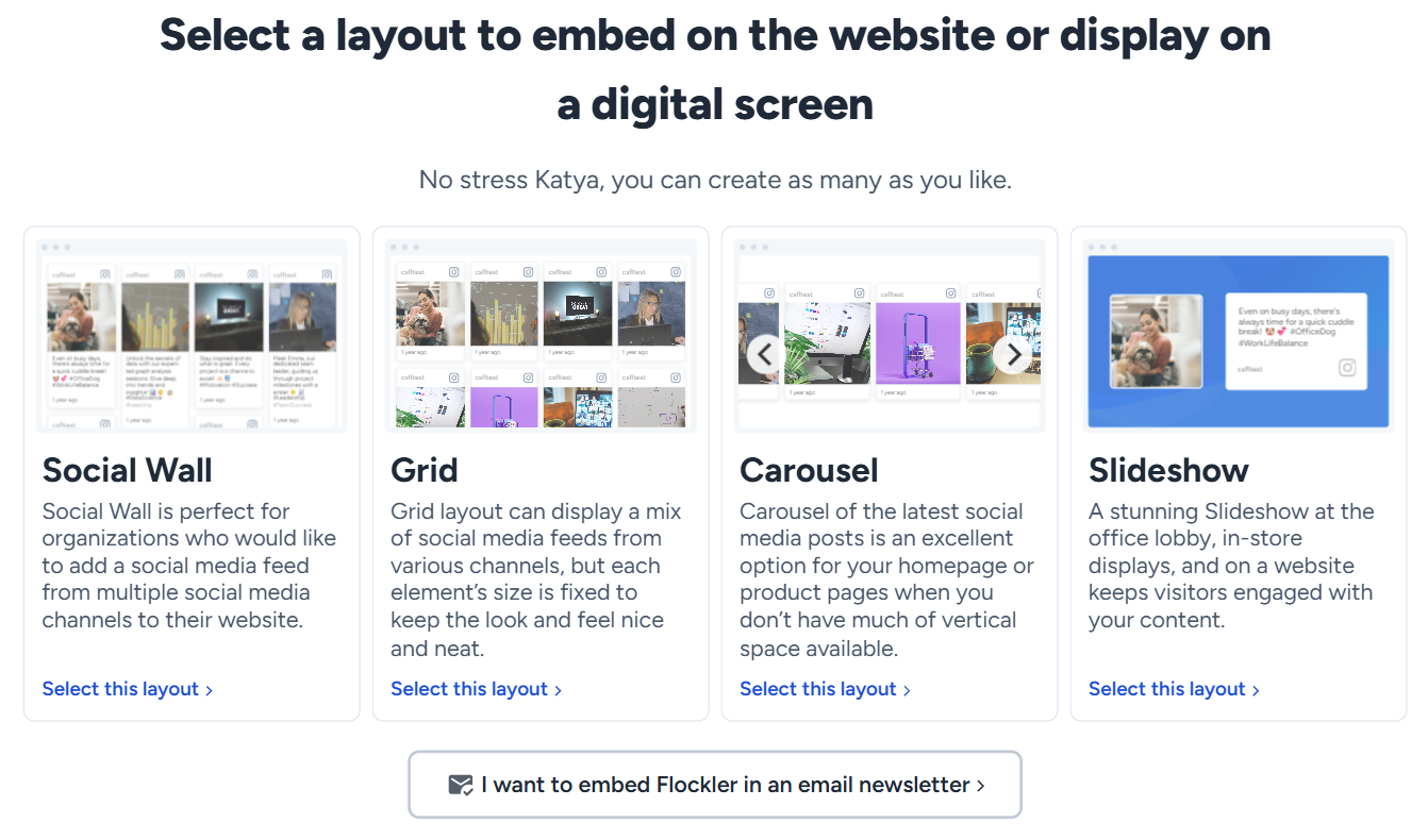 Welcome to Flockler! We're excited to have you on board! Flockler helps you boost engagement, build trust, and increase conversions by seamlessly curating and displaying social content on your website, intranet, and digital screens.