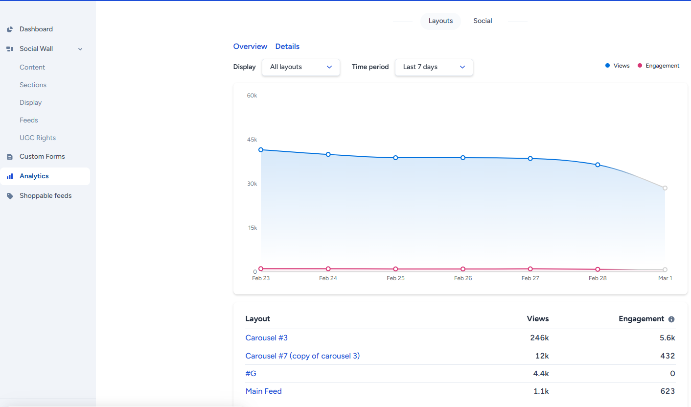 Views are only registered when Flockler is indeed loaded on the page – typically when visitors are a couple of hundred pixels away from the social media feed. Engagement shows the total volume of clicks and other interactions with the layout.