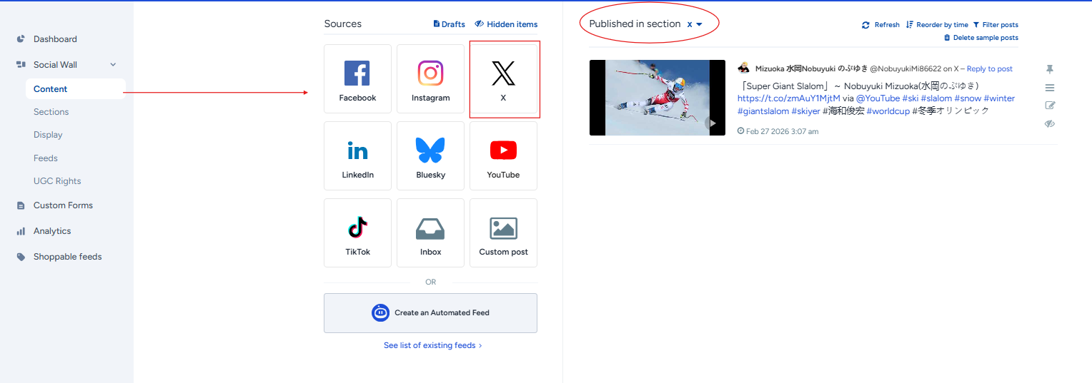 If you want to show hashtag mentions, you’d typically create an auto-updating feed via the Feeds tab. Auto-updating feeds can be moderated with AI, store content in a moderation queue (Flockler’s Inbox), or automatically display content on websites, display screens, and other digital services.