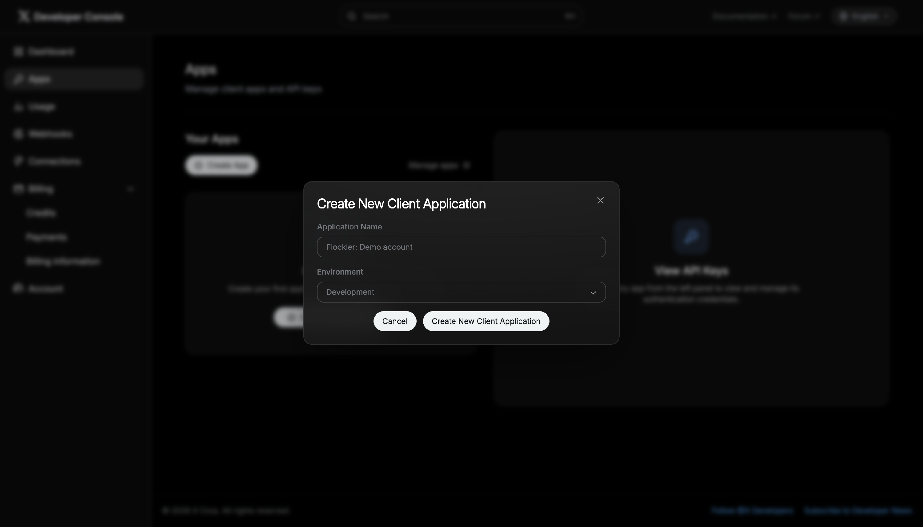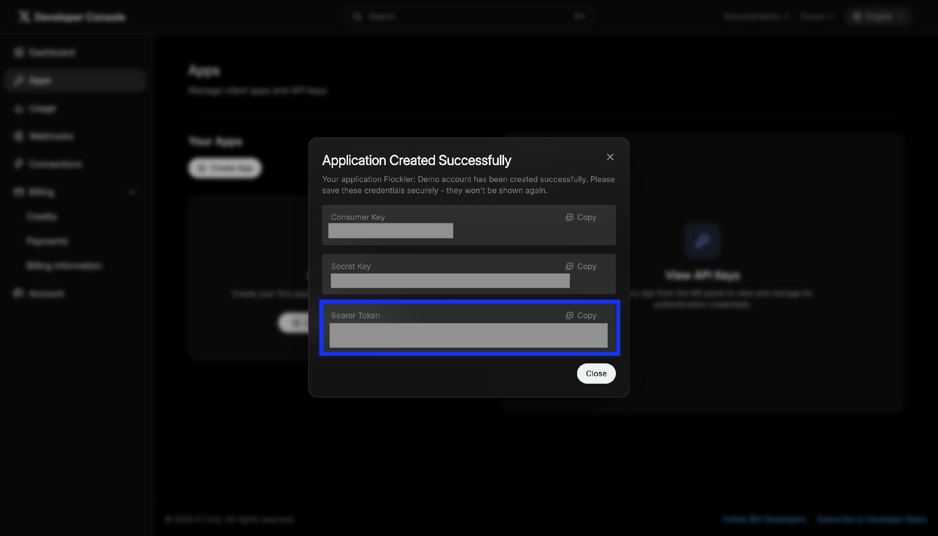 After creating the app, X will generate a pop-up showing your app credentials.