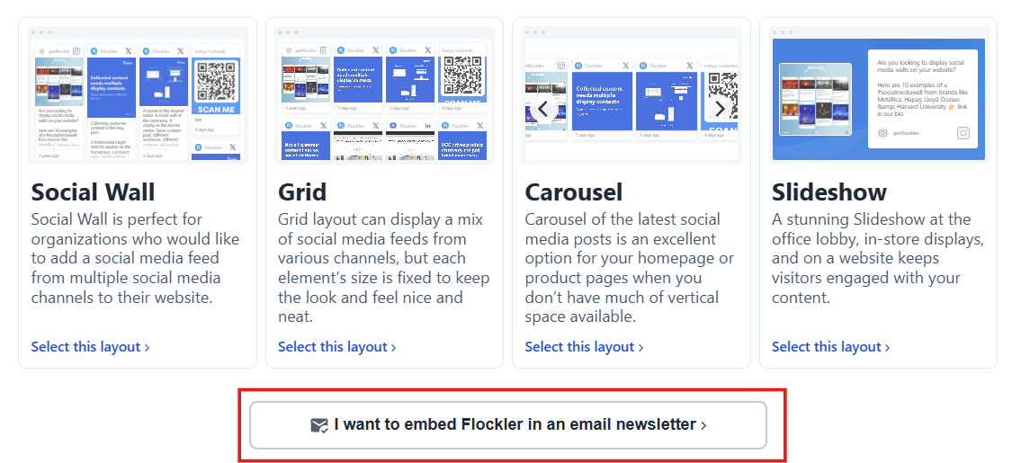 Go to the 'Display' tab and click the 'Create a new layout' button. Then, choose 'I want to embed Flockler in an email newsletter' just below the website layouts.