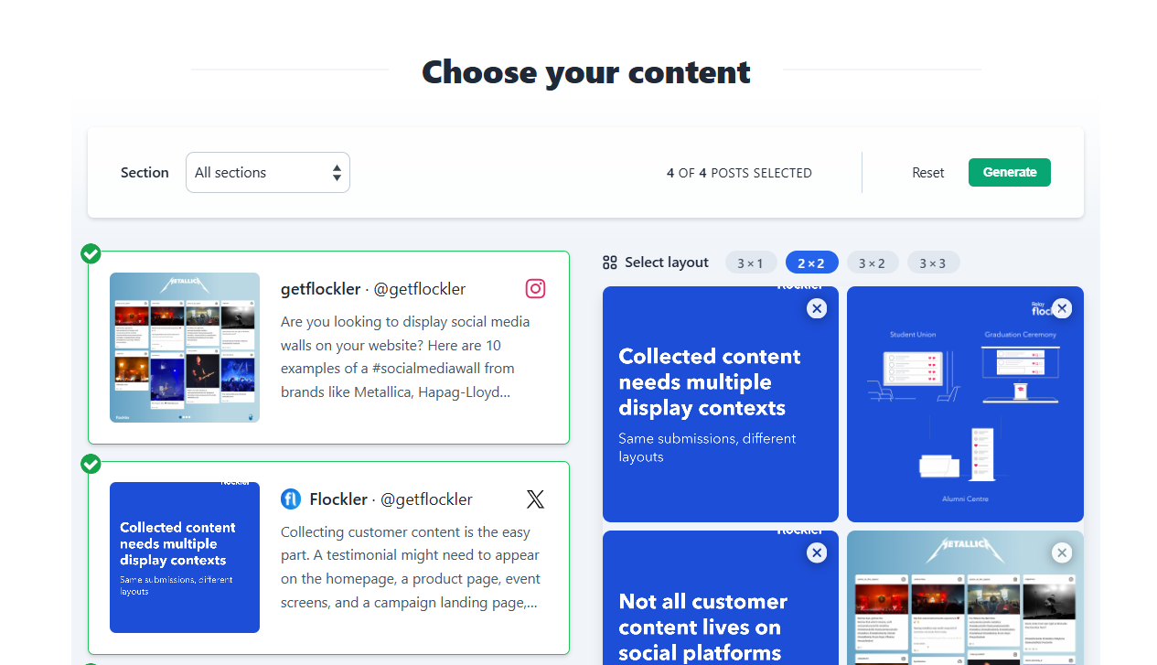 Embedding Flockler in your favourite email marketing platform is straightforward. We currently support posts with an image or video from all supported channels.