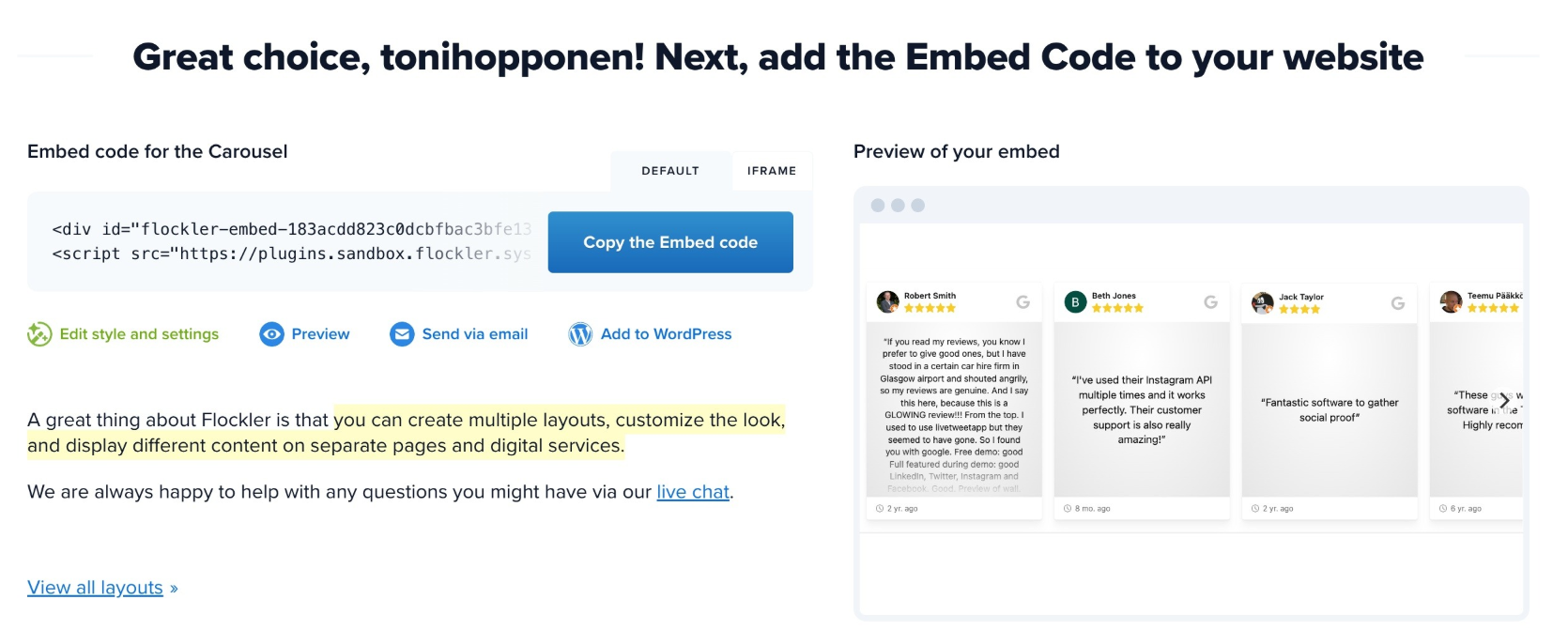 Your final step is to add Google Reviews to your website. After choosing the layout, you’ll get an embed code which you can copy and paste to any website builder and webshop.