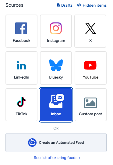 After signing up, select Google Reviews from the list of supported content sources. If you already have an account with us, navigate to the 'Feeds' tab and click the 'Add a new automated feed' button.