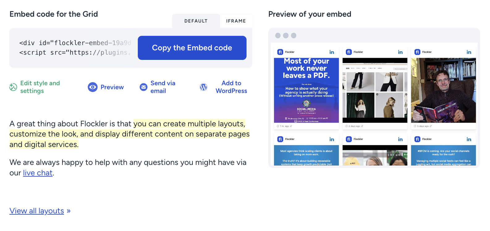 From Flockler’s 'Display' tab, you can edit the look & feel of each layout and embed code. Click 'Edit style & settings' for any of the layouts.