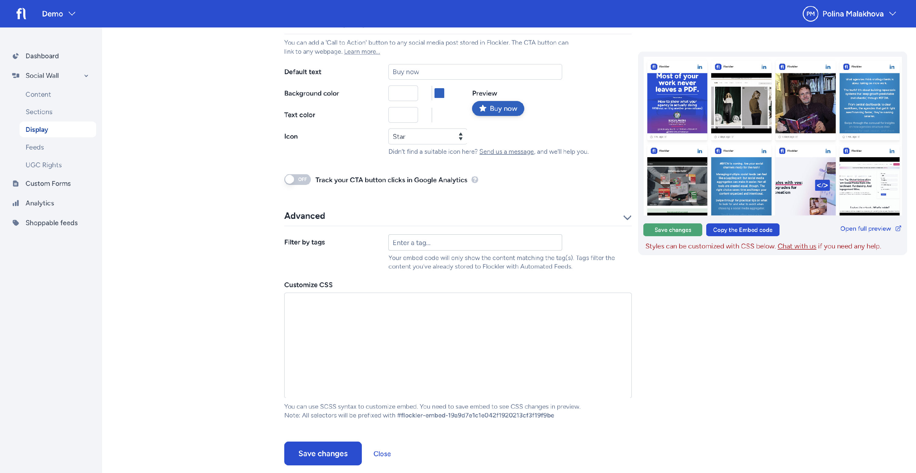 To add your custom CSS via Flockler’s dashboard, click the 'Display' tab in navigation and then 'Edit style and settings' for any of the layouts you’ve created.