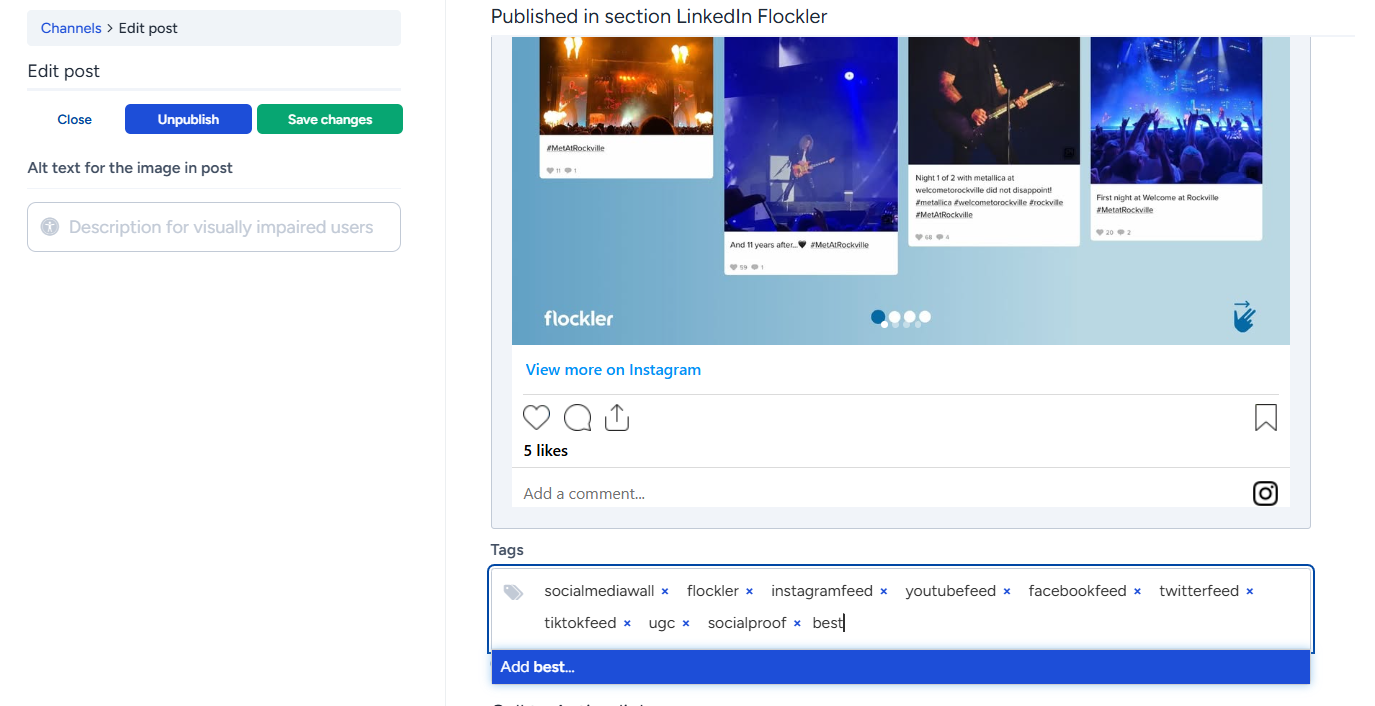 Flockler automatically converts hashtags to tags, but sometimes you may want to add your own custom tags. For example, to highlight a curated selection of your favourite posts with a tag like best.