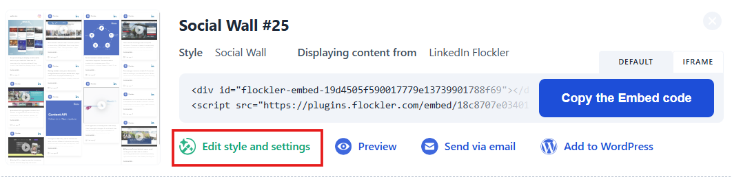 - After selecting the layout, Flockler will generate an embed code. Click Edit settings & styles below the embed code.