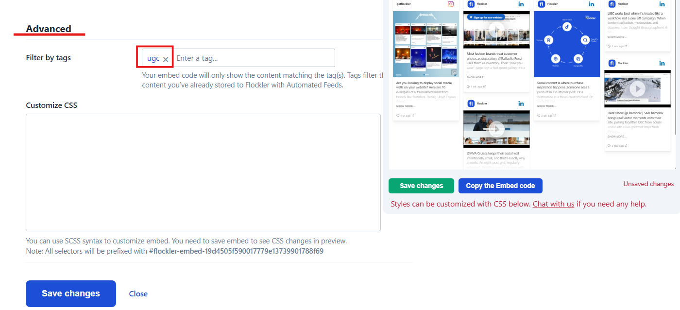 If you want to display only posts with a specific tag, let’s say you want your homepage to show only posts tagged ugc, you can easily create a filtered embed code, and you don’t need to create an automated feed for it.