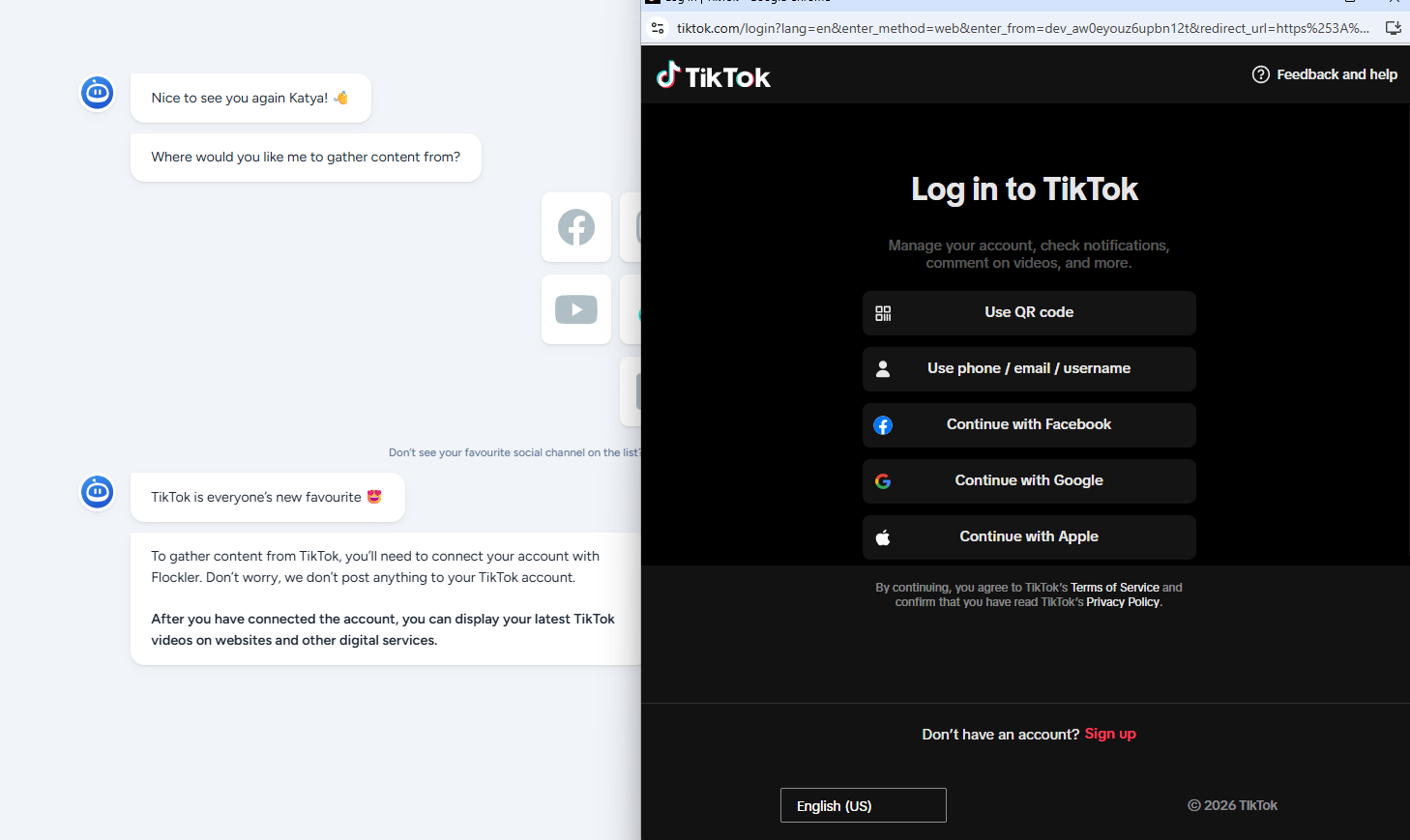 Select TikTok from the supported channels. Click to connect your account, and a pop-up window opens up