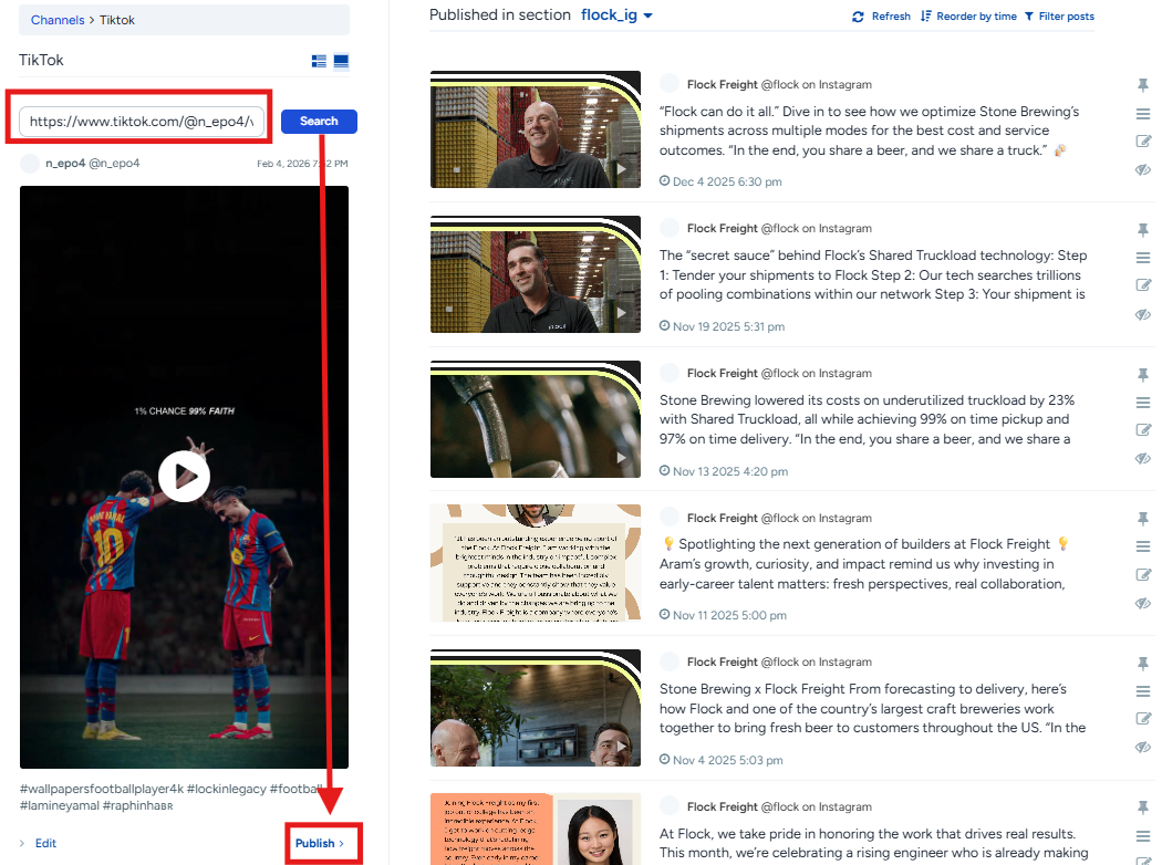 Copy & paste the link to the post in the field, and a preview will open up. If you are happy with the content, click Publish, and the video appears in your social media feed.
