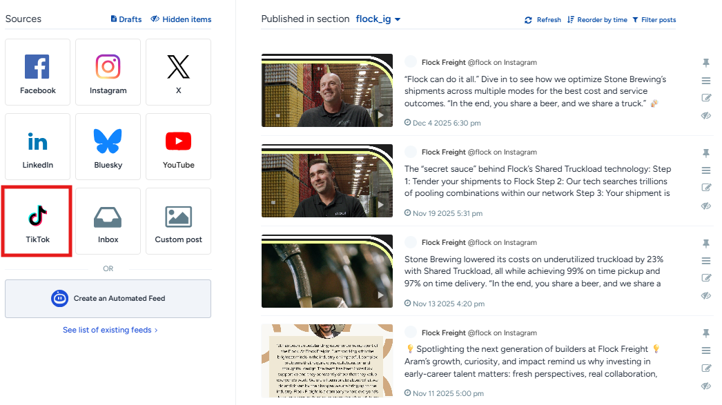 TikTok doesn’t yet have a hashtag feed available for developer partners like Flockler, but you can add TikTok videos from any user or by a hashtag with a few simple steps.